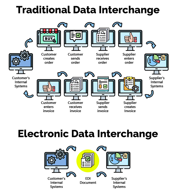 EDI (Intercambio Electrónico de Datos) es un formato estándar para intercambiar documentos comerciales como pedidos de compra o facturas entre dos empresas de forma electrónica, es decir, sin papel. Utilizando EDI, la información se traslada directamente desde el ERP de una empresa al ERP de la otra, dando solución a los escenarios B2B. Los estándares de EDI se encargan de definir el formato de la información a intercambiar.