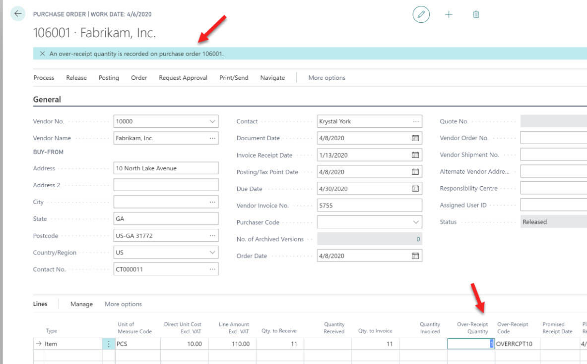 For articles and suppliers you can check this tolerance in the Over-Receipt Codes field. When you have configured this Over-receipt field, you can enter a quantity greater than the one requested in the Quantity to Receive field in warehouse orders and receipts.