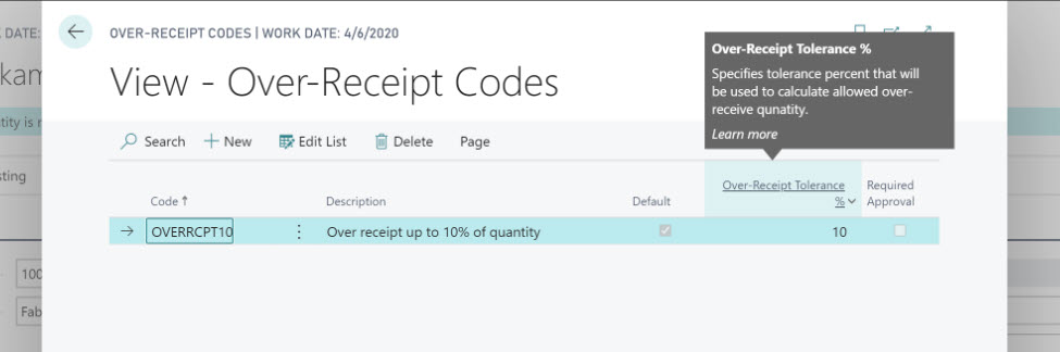 Through this improvement, those who process orders or work in the warehouse can now enter this surplus. First, you will have to configure the Over-Receipt Codes page and complete the tolerance percentage of the reception. On this page you can decide the additional% that you are willing to accept by default for each specific provider or for all.