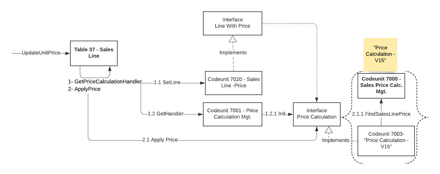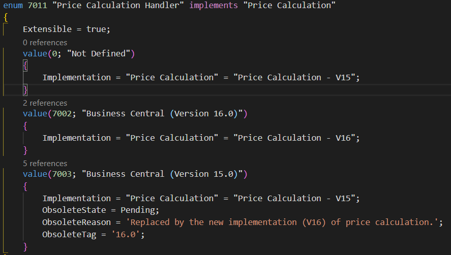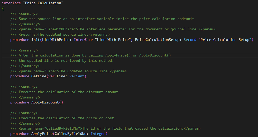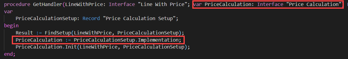 In the following example we show the two price calculation codeunits of the two versions of Business Central that implement the Price Calculation interface:
