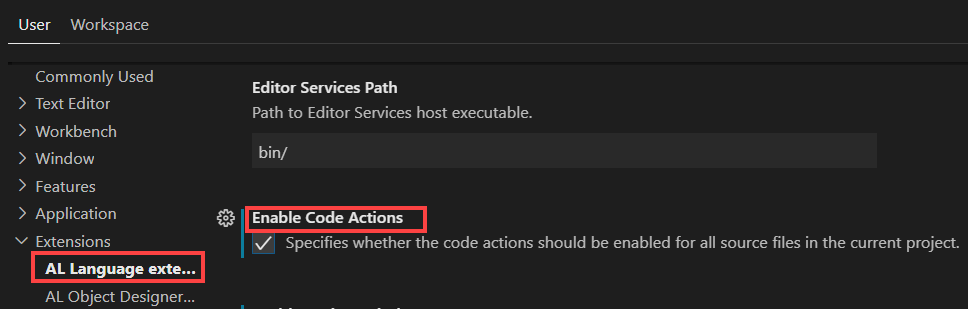 If the light bulb is not shown or the option of Implement interface is not offered, it is because in the settings file the Enable Code Analysis option must be activated for the AL Language extension.