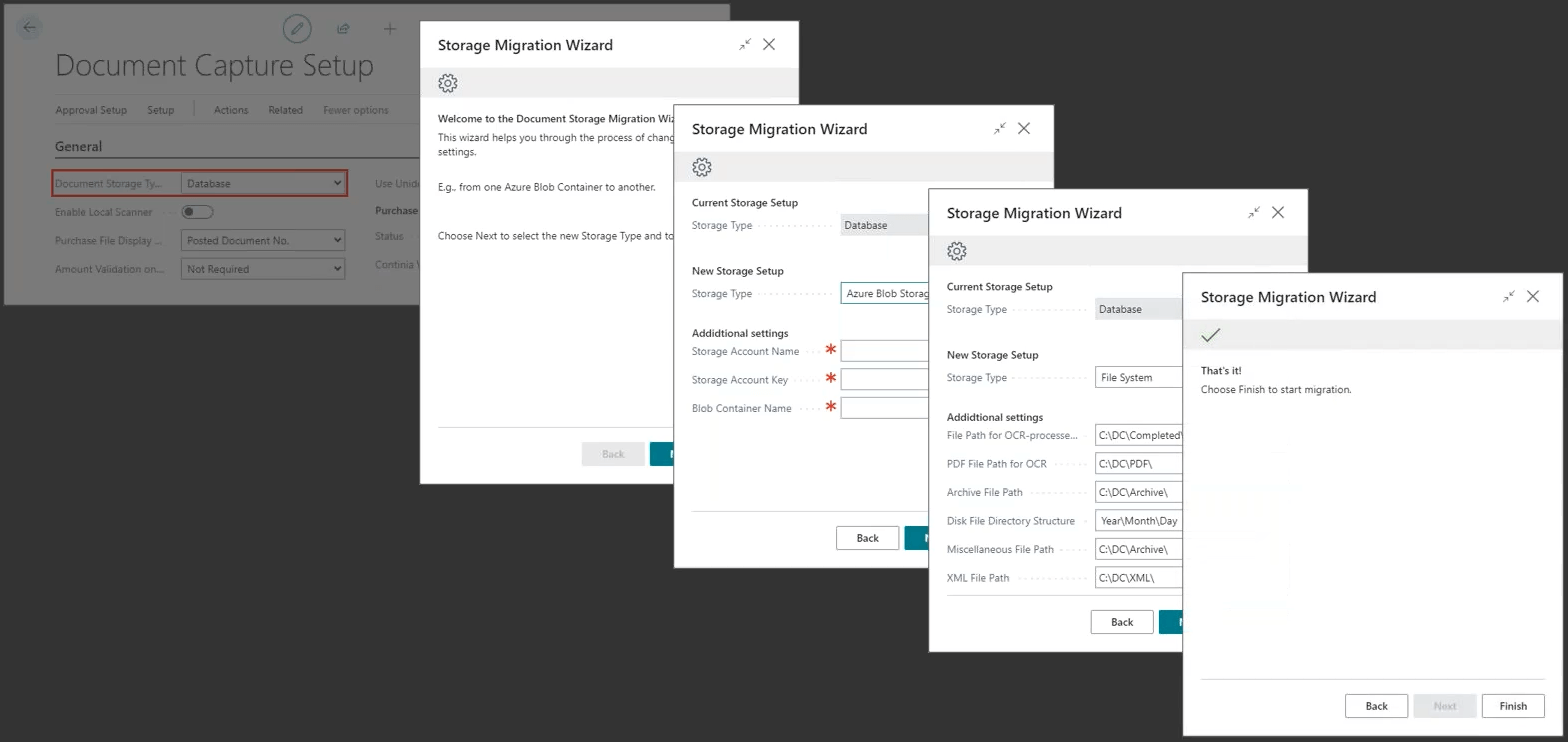 This new wizzard will help you migrate your storage within Document Capture. For example, it offers support for migration between two “equal” storage types, such as Archive > Archive or Azure Blob > Azure Blob and additional validation of Azure Blob credentials, as well as a connection test.