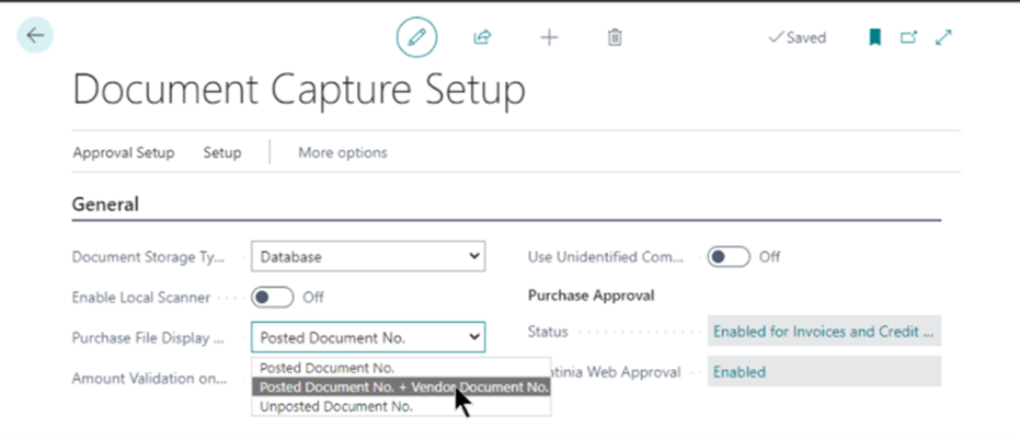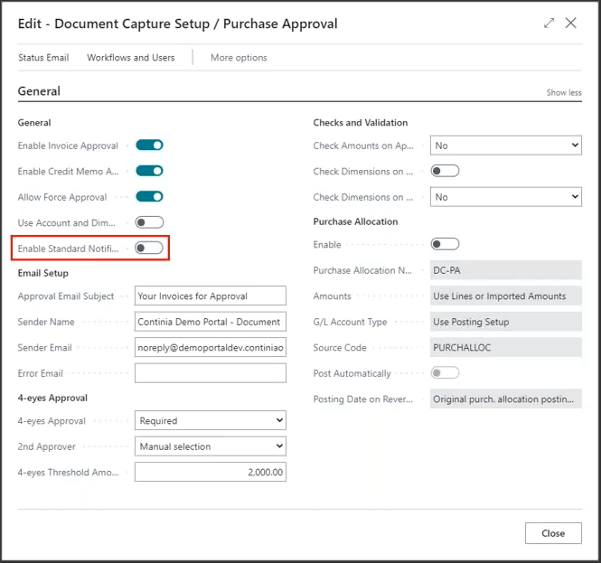 When an email needs to be sent to a user you will now have the ability to choose whether you prefer the notification sent by standard Business Central or if you prefer the notification sent >by Document Capture.