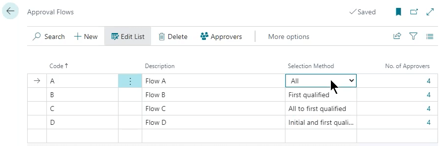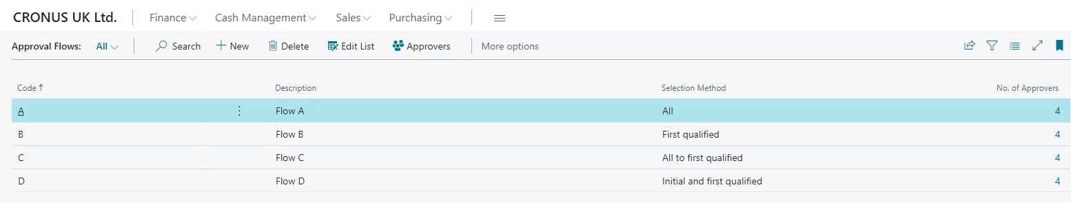 For this example we have created 4 approval flow codes, with different associated methods. We can choose between: