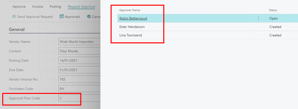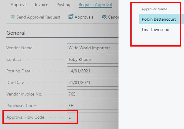 - First qualified: this flow will send approval to the first person who has the permissions to approve at that economic limit. Only one approval request will be sent to one approver, and the rest will be left aside as they are not needed. For example: for the document quantity and approval code B, only Lina is sent the request.