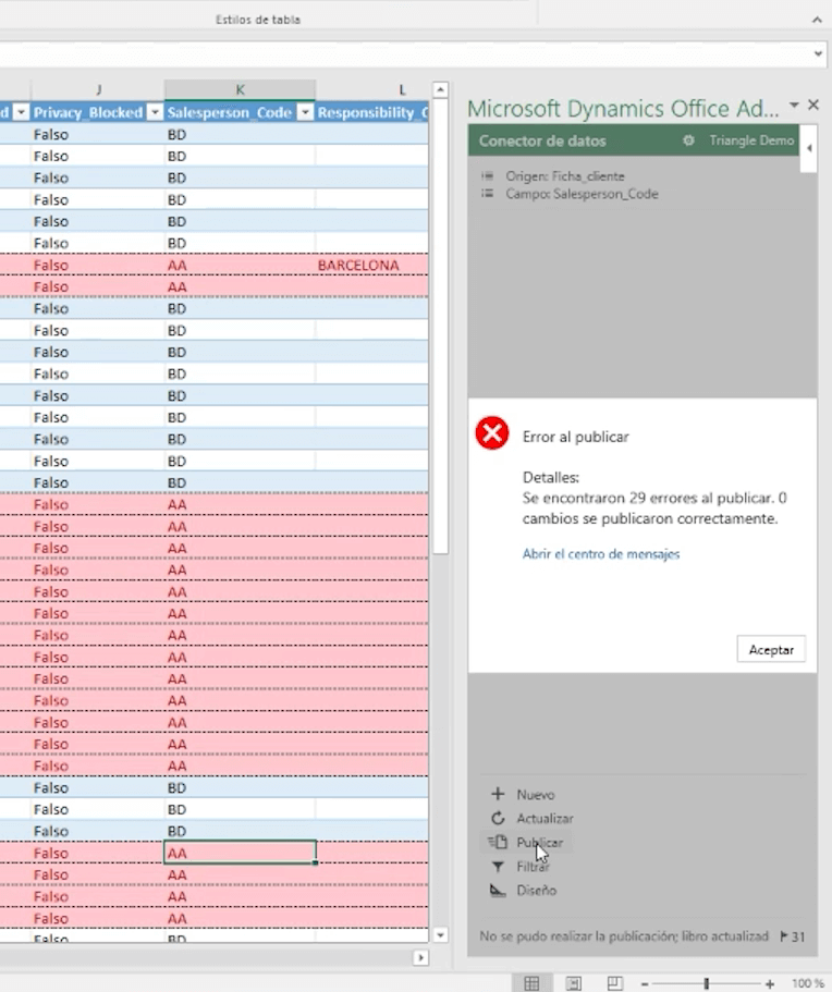 Para mostraros que existe un control de veracidad, vamos a introducir un código de vendedor que no está creado en Business Central. Cuando intentemos publicar los cambios veremos que nos aparece el siguiente error conforme este código no corresponde a un vendedor de BC.