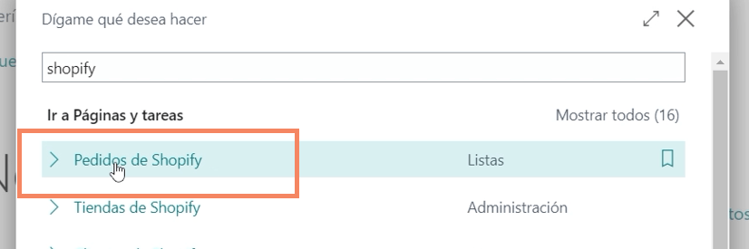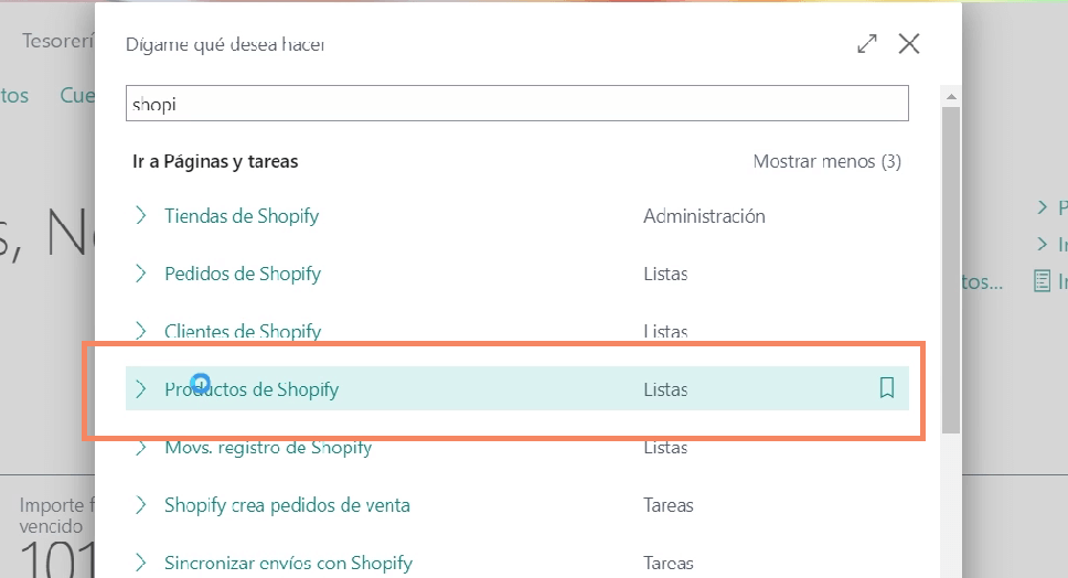 Sigamos con los pasos en Business Central, en primer lugar desde el icono del buscador vamos a buscar los productos de Shopify, recuerda que puedes mostrar más para ver la lista completa.