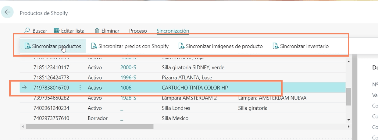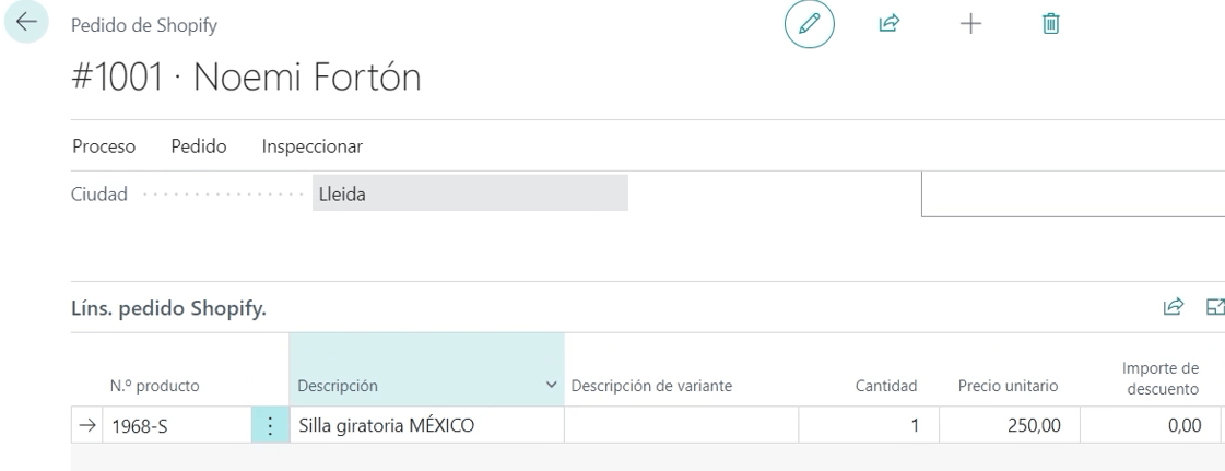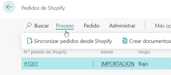 El siguiente paso es ver como este pedido ha entrado en Business Central, buscamos pedidos de Shopify y sincronizamos las órdenes de la tienda en concreto en la que hemos realizado el pedido y aquí nos aparece este pedido que hemos creado.