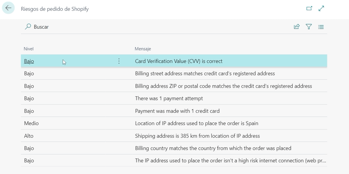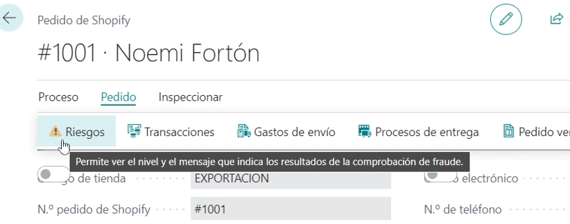 Una nueva opción que hasta ahora no teníamos en Business Central se llama riesgos y aquí nos pone por nivel de riesgos. Los posibles riesgos que nos muestra Shopify por ejemplo son de nivel bajo, es que se ha verificado que el cvv de la tarjeta y la calle de facturación es la misma de la que