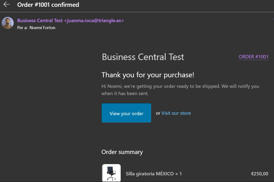 En la integración con Business Central y Shopify también se llega al nivel final, donde el cliente recibe su correspondiente correo electrónico.