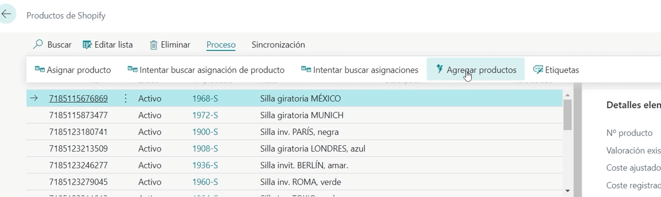 En esta página se nos muestran los productos que ya tenemos sincronizados con Shopify, si queremos añadir un producto nuevo vamos a tener que hacer clic en proceso y agregar productos.