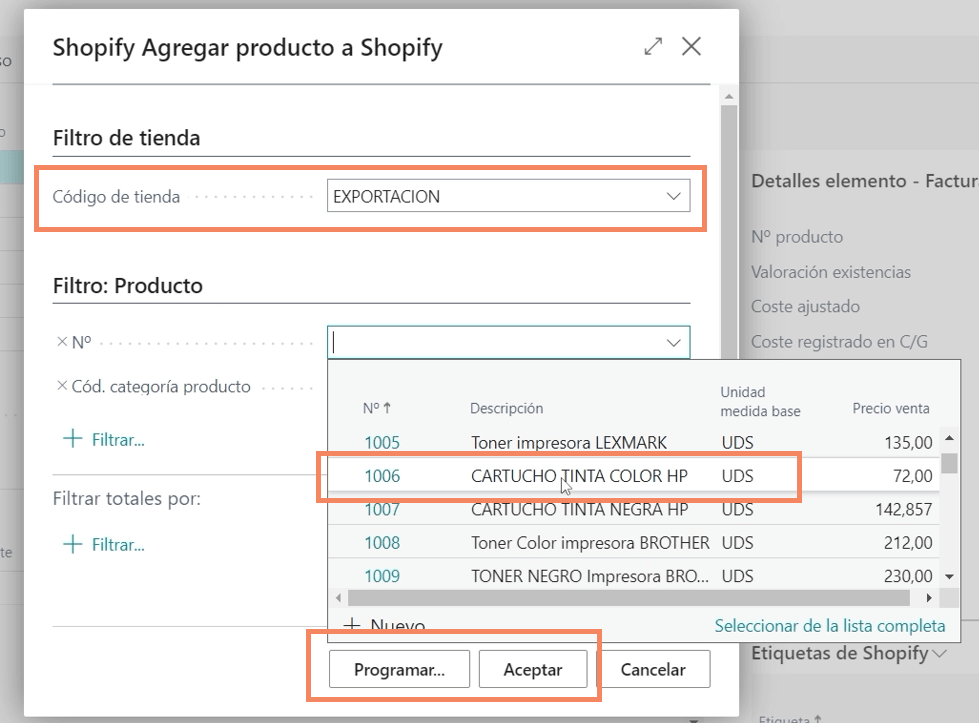 En este ejemplo seleccionamos el «Cartucho de Tinta Color HP, una de las opciones que tienes es la de programar en el caso que tengas muchos productos, en este caso vamos a aceptar y directamente en este proceso Business Central sincronizar el ítem, los precios y demás información.
