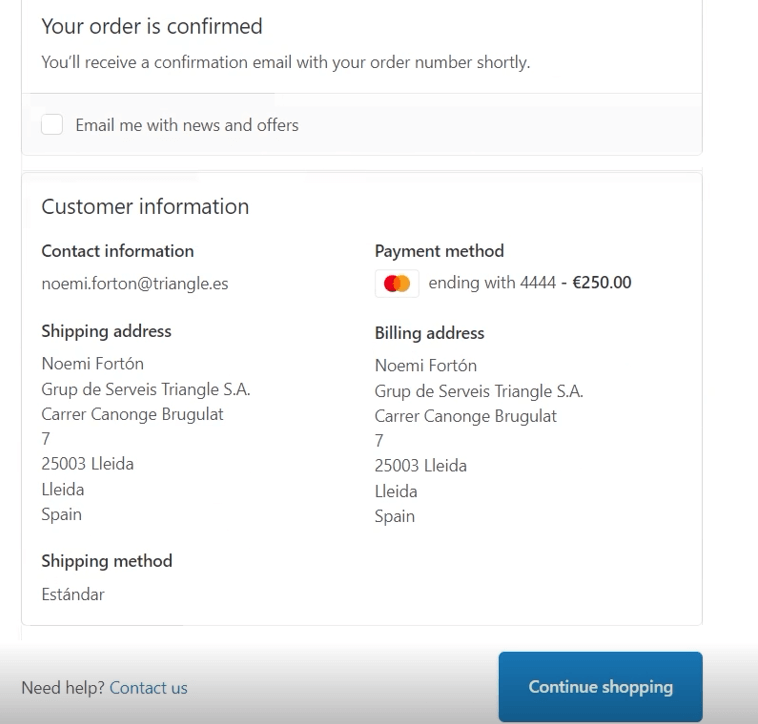 - Gastos de envío: para comprobamos que el cliente escogió la opción estándar que en este caso ofrecíamos de forma gratuita, pero si tuviéramos por ejemplo envío urgente pues también nos aparecería en esta ventana