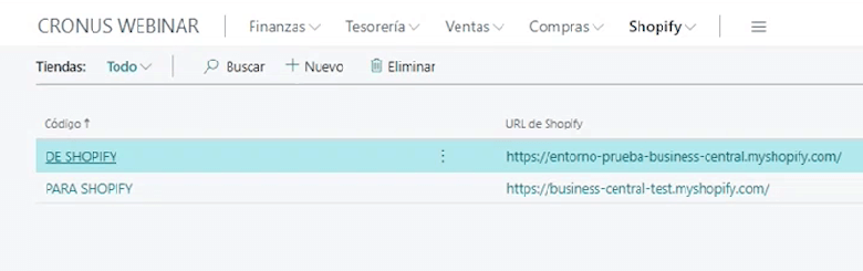 Todo el resto de configuración la realizaremos en BC. La primera está en TIENDAS. Aquí es donde crearemos las diferentes tiendas que tengamos en Shopify. De manera que si tienes más de una tienda en Shopify, puedes gestionarlas todas mediante este conector y deberás crear los diferentes sites en esta configuración