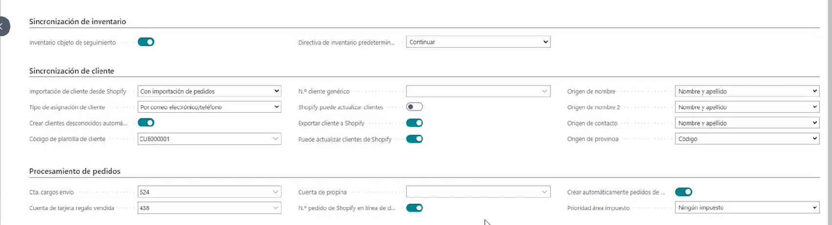 - Cuentas para cargos de envío, tarjetas de regalo y si aceptamos propinas e importante, destacar el boleano de crear automáticamente pedidos de venta, que en un momento veremos qué significa.
