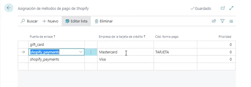 En este caso, los campos Puerta de enlace y Compañía de tarjeta de crédito, se crean automáticamente cuando importamos pedidos desde Shopify. En el campo Código de método de pago es donde introduciremos el equivalente en Business Central para realizar el mapeo.