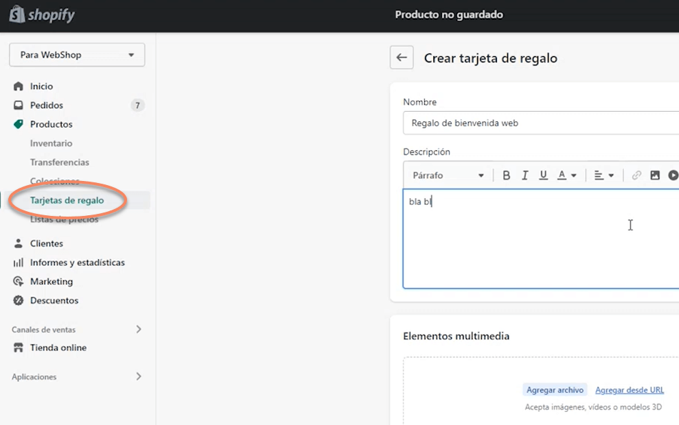 Desde el menú principal de shopify tenemos acceso a esta funcionalidad. Creamos una tarjeta de regalo rápidamente una gift card en el backoffice de Shopify.