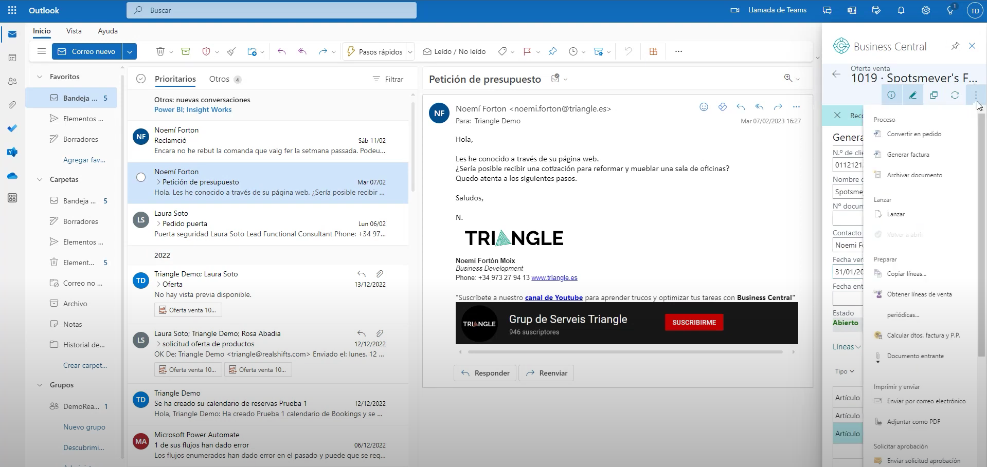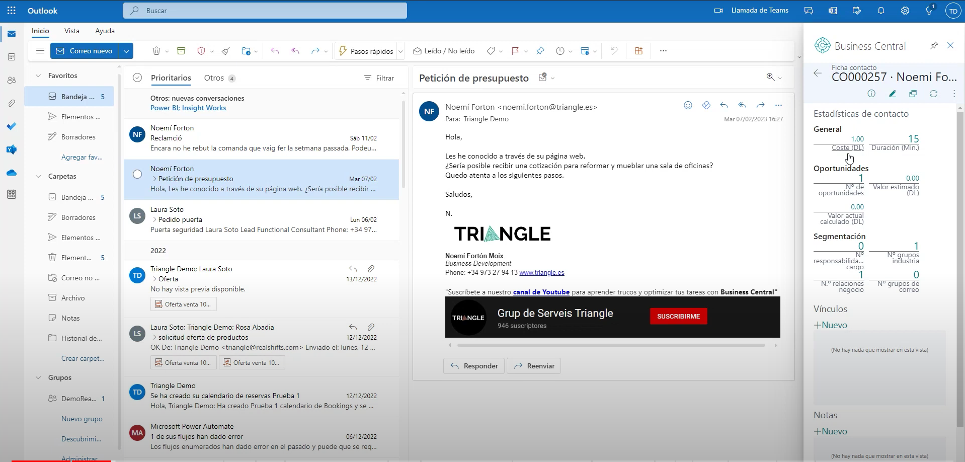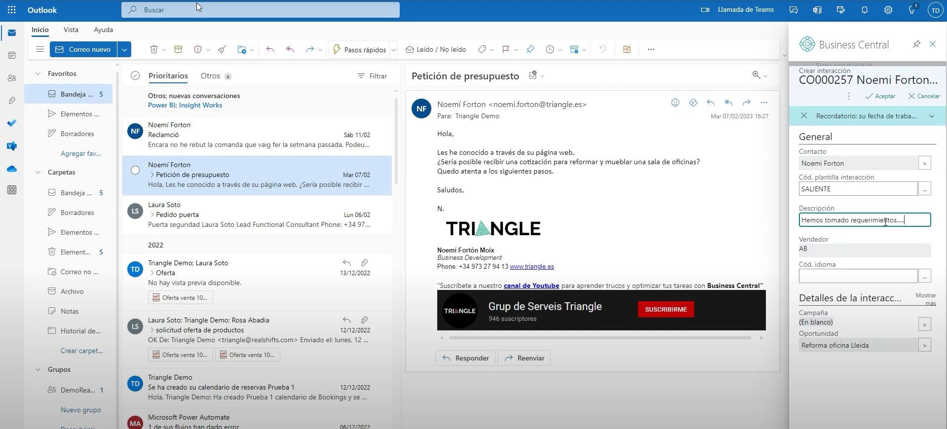 Una de las funcionalidades más interesantes de Business Central en relación con nuestra gestión comercial es el email logging, que te permite visualizar los correos electrónicos enviados desde Outlook en la página de movimientos de interacción. Para utilizar esta funcionalidad, es necesario hacer una configuración previa y un setup un poco complejo, pero puedes contar con la ayuda de expertos como Triangle para hacerlo.