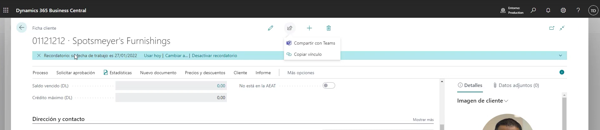 Teams es otra herramienta que puede ayudar a aumentar la productividad del equipo comercial en combinación con Business Central. Con esta herramienta es posible compartir directamente cualquier registro, vista, etc. a través del botón de compartir en Teams.