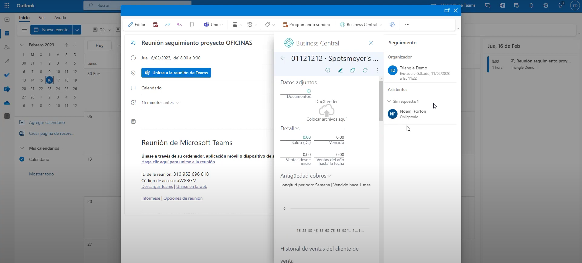 Otra forma de mejorar la productividad es utilizando el calendario de Outlook. Se puede expandir la vista de la sesión y ver todas las oportunidades de ventas relacionadas con una reunión en particular.