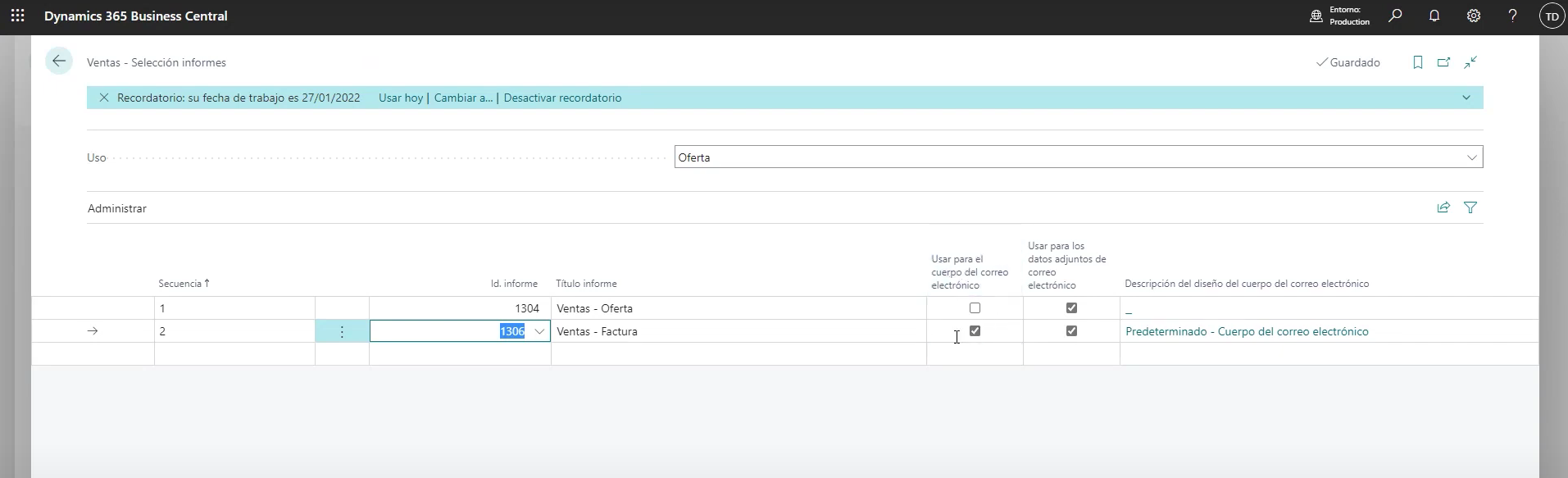 Por ejemplo, se puede hacer una factura que corresponda al informe 1306 y marcar la casilla «usar para el cuerpo del correo electrónico». En la descripción del diseño del cuerpo del correo electrónico, se puede seleccionar qué diseño se quiere de la lista. Se pueden ver los mensajes de correo que podrían ser útiles, ejecutando el informe a modo de pruebas, y decidir si el diseño nos convence.