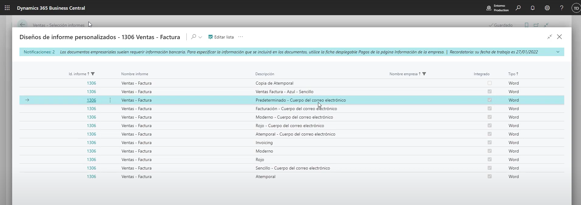 Otra funcionalidad interesante de Business Central es la posibilidad de definir los cuerpos de los mensajes de correo electrónico, incluyendo información clave de documentos de venta y compra en los textos para los correos electrónicos. Para ello, es necesario utilizar informes que definan el estilo y el contenido del texto en los correos electrónicos. Es importante tener en cuenta que para usar el diseño para crear contenido para mensajes de correo electrónico, se debe utilizar el tipo de archivo de Word para su diseño.