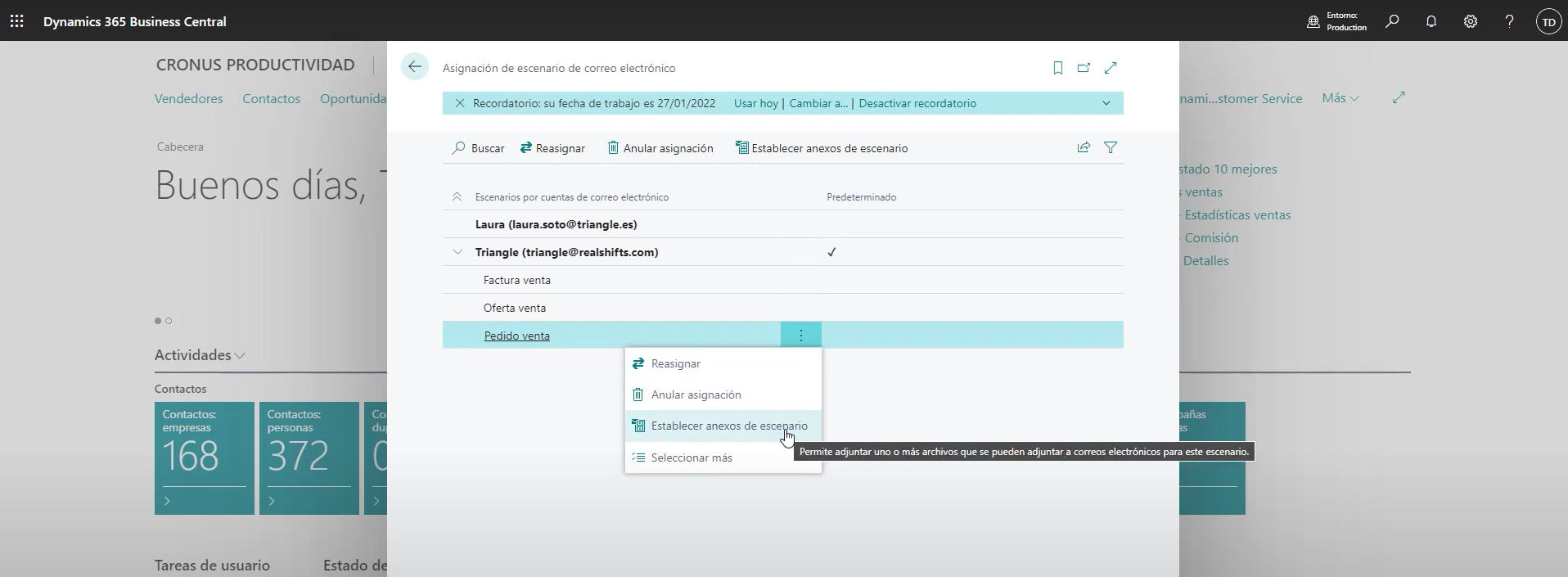 Se pueden agregar aquellos que necesitemos y marcar cuáles queremos que se adjunte por defecto automáticamente. Cuando se envíe un correo electrónico para el escenario que se ha definido, los archivos adjuntos predeterminados se insertan automáticamente en un borrador de mensaje de correo electrónico para dicho escenario.