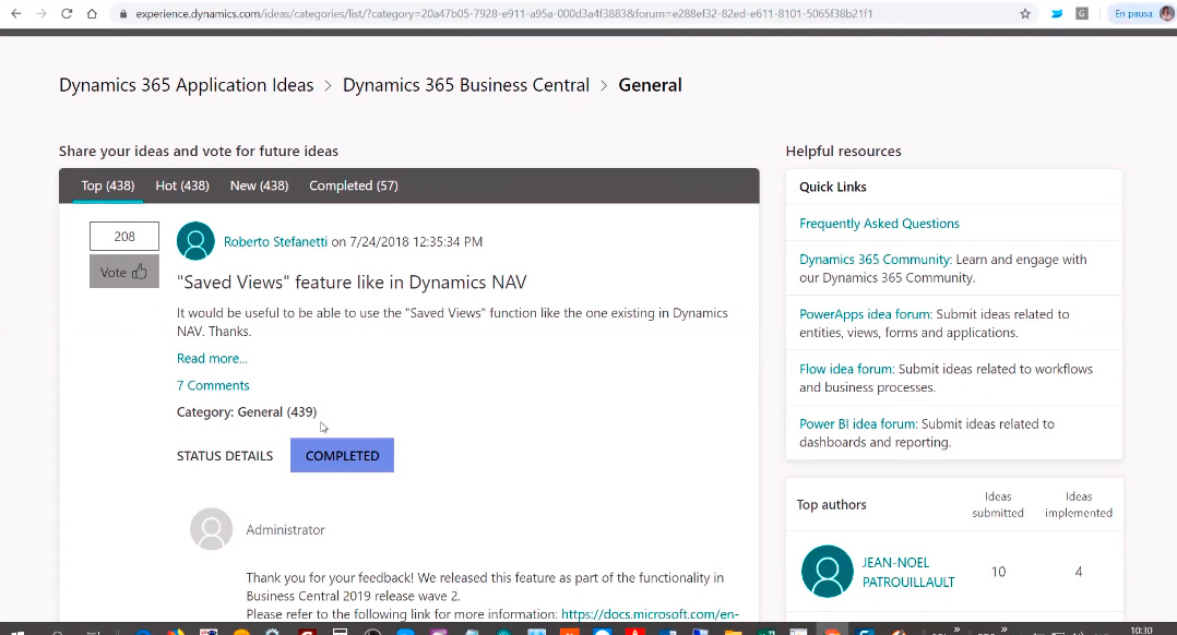 Recordar que también vosotros podéis sugerir ideas y mejoras para que Microsoft los tenga en cuenta para los siguientes releases. Podéis crear estas sugerencias y votar las ya existentes en experience.dynamics.com/ideas. Os animamos a que realicen este tipo de comentarios porque a lo mejor un requerimiento que pensáis seguro que es compartido por demás usuarios de la herramienta y de forma colaborativa podemos decidir el futuro del producto.
