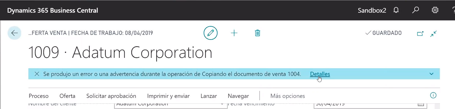 Cuando utilizamos la función Copiar documento para crear nuevos documentos basados en documentos existentes, ahora se nos notifica si algún elemento o recurso en las líneas del documento de origen está bloqueado. Las líneas de documento bloqueadas se excluyen del nuevo documento.
