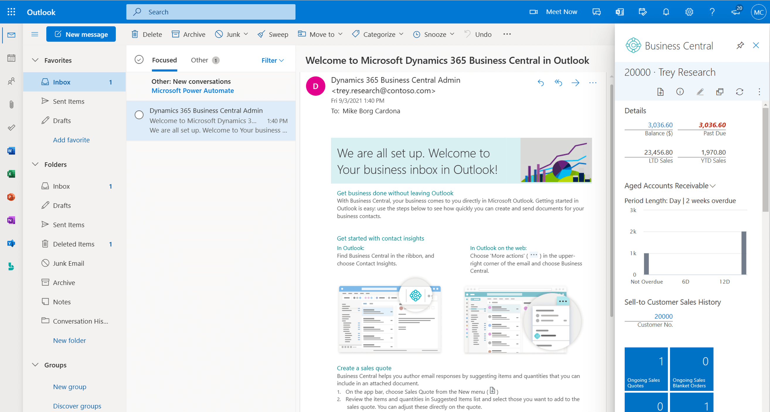 Además, con la combinación de Business Central y Outlook se pueden llevar a cabo otras acciones que ahorran tiempo y aumentan la productividad. Por ejemplo, en solo dos clics se puede cambiar el número de cuenta de un cliente para sus próximos giros. También se pueden visualizar los pedidos pendientes de servir para ofrecer información rápida sobre cuándo estarán disponibles para su envío. Estas son solo algunas de las muchas acciones que los clientes utilizan diariamente para mejorar la eficiencia de sus negocios.