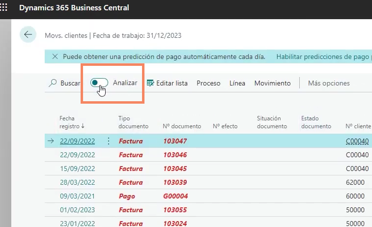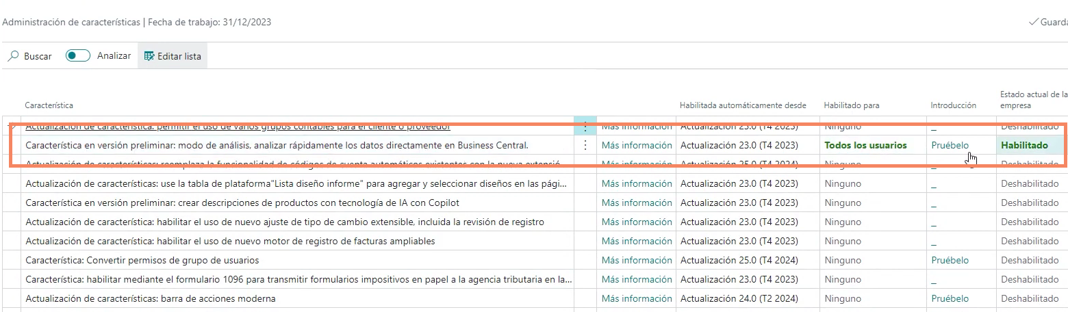 Para activar el análisis de datos en Business Central, lo primero que tienes que hacer es habilitar la funcionalidad en la administración de características. Una vez hecho esto, verás que en las páginas de tipo lista aparece un toggle que te permite activar o desactivar el modo análisis.