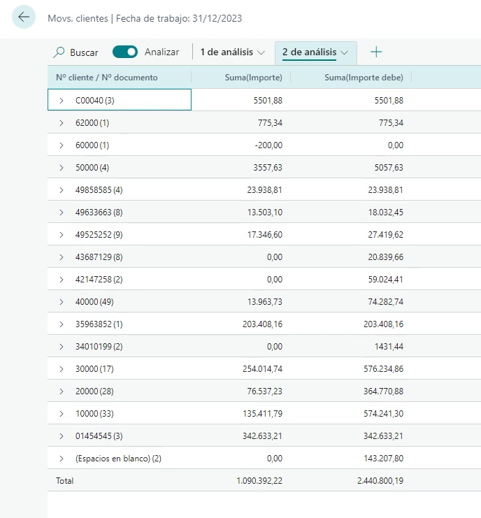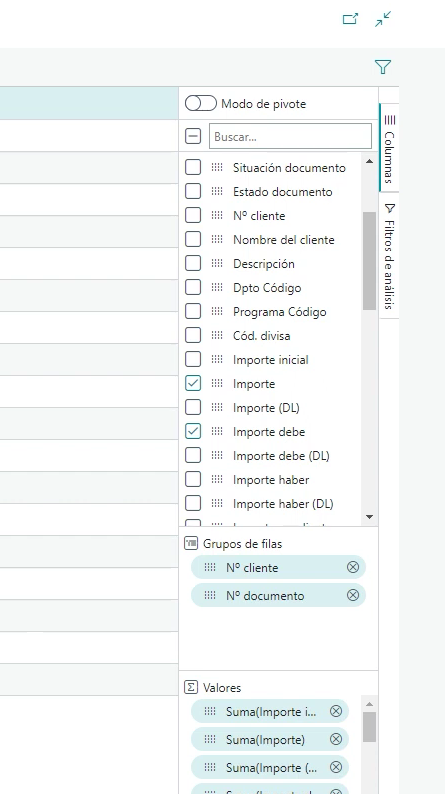 Para ello, tienes que ir a la página de movimientos de cliente y activar el modo análisis. Luego, tienes que arrastrar las columnas de número de cliente, número de documento, tipo de documento, fecha de vencimiento e importe a la vista de datos. Después, puedes ordenar las columnas por fecha de vencimiento y anclar la columna de número de cliente. Por último, puedes seleccionar las celdas que te interesen para ver el total y las estadísticas.