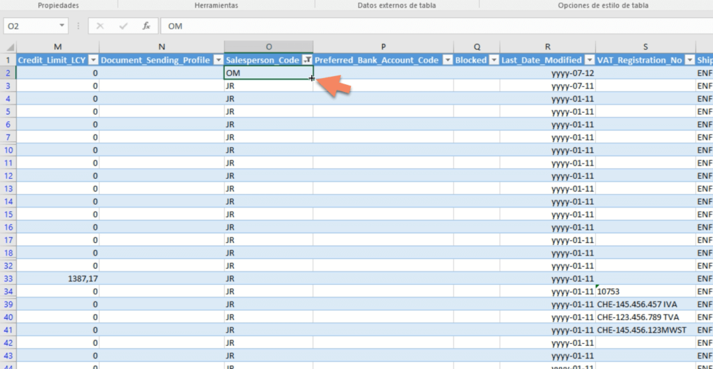 Seguiremos el mismo proceso que en el ejemplo anterior: abrimos el documento y habilitamos la edición para que se nos cargue el Add-in de Excel. Luego buscamos la columna que contiene el código del vendedor. En este ejemplo corresponde a la columna Letra O, en la cual vemos como vendedores “JR”, “PR” y celdas vacías.