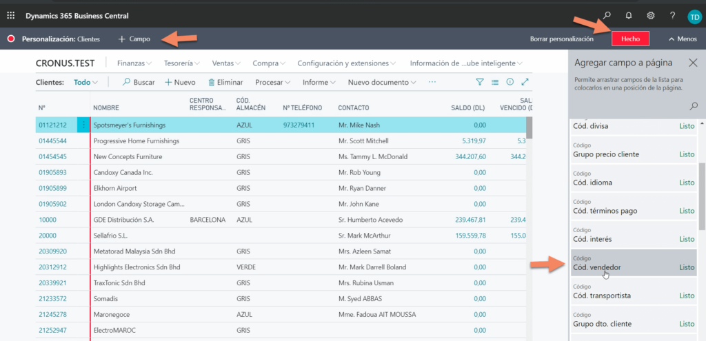 Para seguir con este ejemplo, vemos que la lista de clientes no tiene mostrada la columna de vendedores. Rápidamente el mismo usuario puede crear esta personalización básica. Buscamos la columna del código vendedor y se arrastra donde se desee visualizarla. Una vez aceptamos, se aplican los cambios para ese usuario.