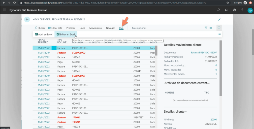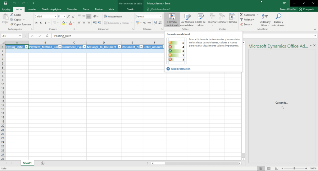 En todas las páginas de listas vemos que nos aparece la opción de “Abrir en Excel” y “Editar en Excel”. Hacemos clic en “Editar en Excel”, descargamos el listado de movimiento de clientes y cuando lo abrimos en Excel veremos que se carga el add-in de Microsoft Office.