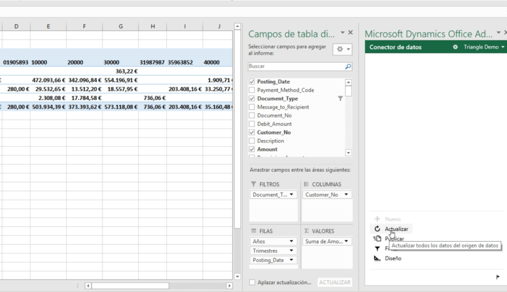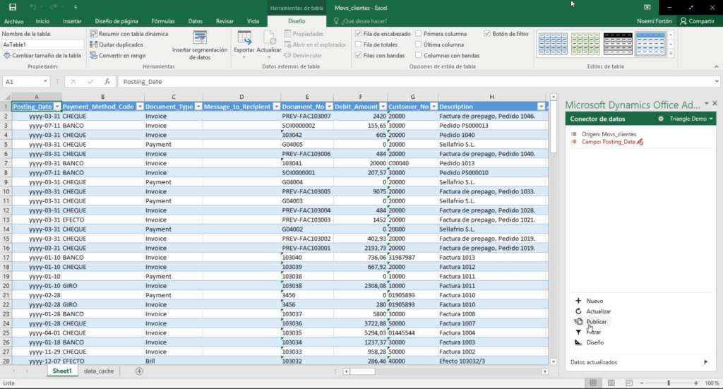 Así se crea una conexión entre nuestros datos y los controles de nuestro ERP. Al abrir Excel, podemos dar damos formato y actualizar los datos. También tendremos la posibilidad de volver a publicar estos datos directamente en el ERP.