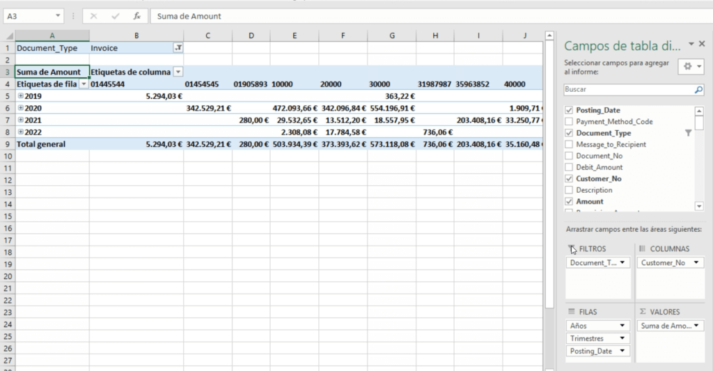 Como vemos la imagen siguiente, ubicamos la fecha como una fila, el número del cliente en las columnas y la suma en los valores. La página de movimientos de cliente contiene todos los documentos del cliente y en este caso solo queremos ver las facturas. Para esta finalidad pondremos un filtro en la tabla dinámica de “document type”.
